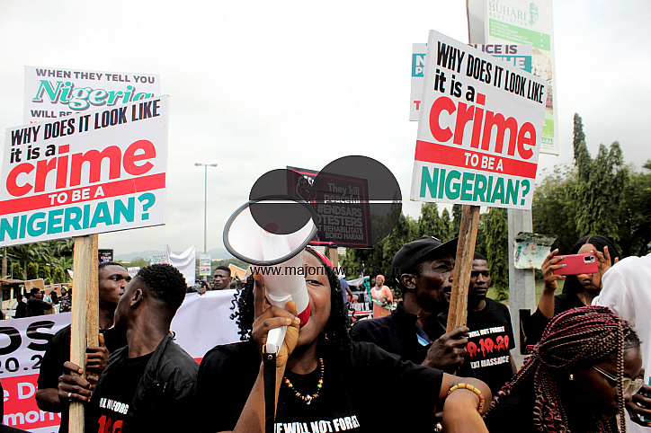 Abuja, Nigeria. 21st October 2021. A memorial rally, commemorating the first anniversary of END SARS was held today in Abuja, the federal capital territory of Nigeria. Protesters chanted songs to ridicule the police, army and criticize the government, even though there was heavy security presence on the highway, where the protesters marched.
