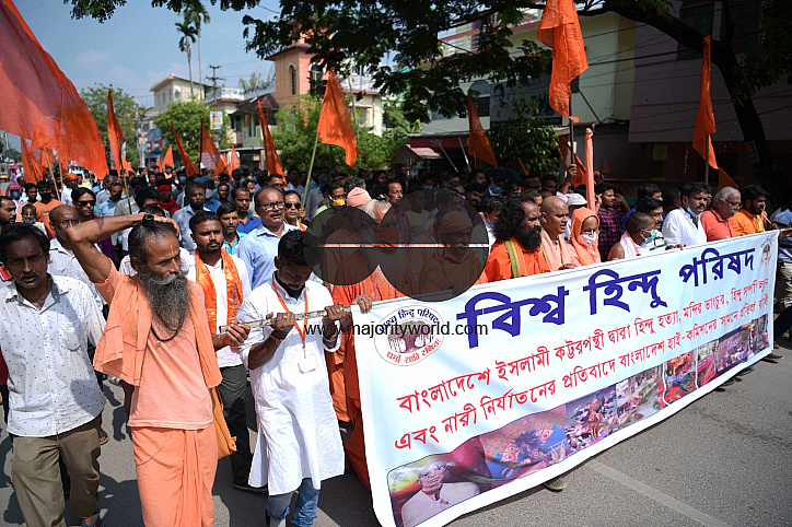 Agartala, Tripura. India protest, members of Vishwa Hindu Parishad, Indian right-wing Hindu organisation, Hindu nationalism, protest rally, temple vandalism, temples in Bangladesh, Bangladesh visa office india, protestors, demonstration in india, Indian p