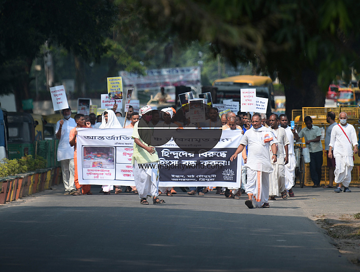 • Image Description: Priests and followers of the ISKCON, at a peaceful prayer vigil to protest against the alleged attack on the ISKCON temple in Bangladesh and demanding justice for Hindus and minorities. The protest was held in front of the Bangladesh visa office in Agarta