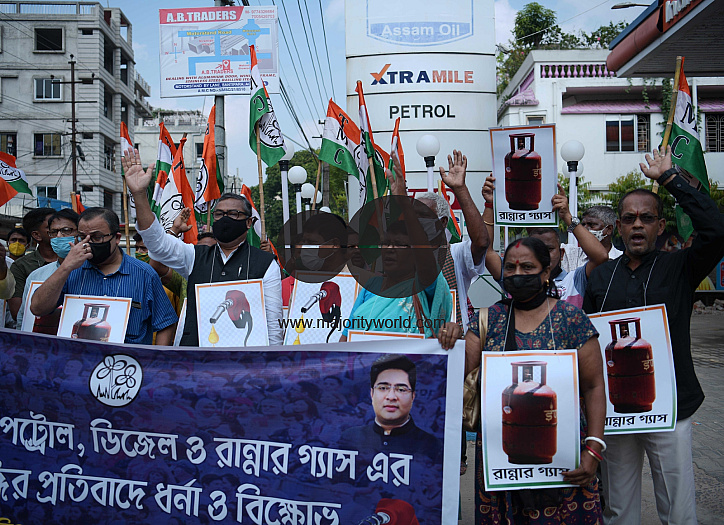 Agartala, Tripura. India. 27th October 2021. The TMC (Trinamool Congress) youth wing activists took part in a protest against the fuel price hike in front of a fuel station at Agartala.