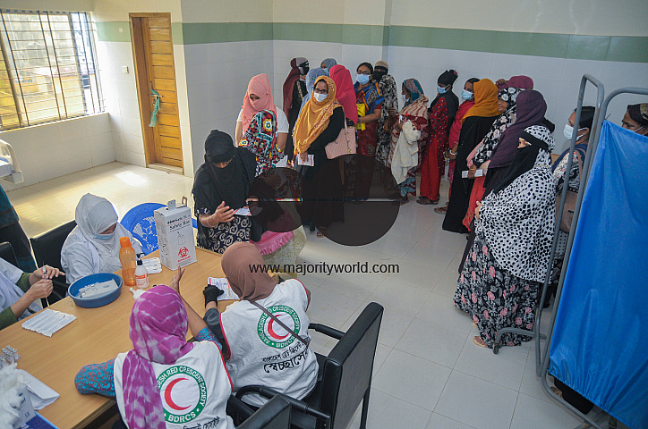 Women in a long queue to take the dose of the China Sinopharm Covid-19 Vaccine at the M A G Osmani medical college & hospital vaccination center. Sylhet, Bangladesh.