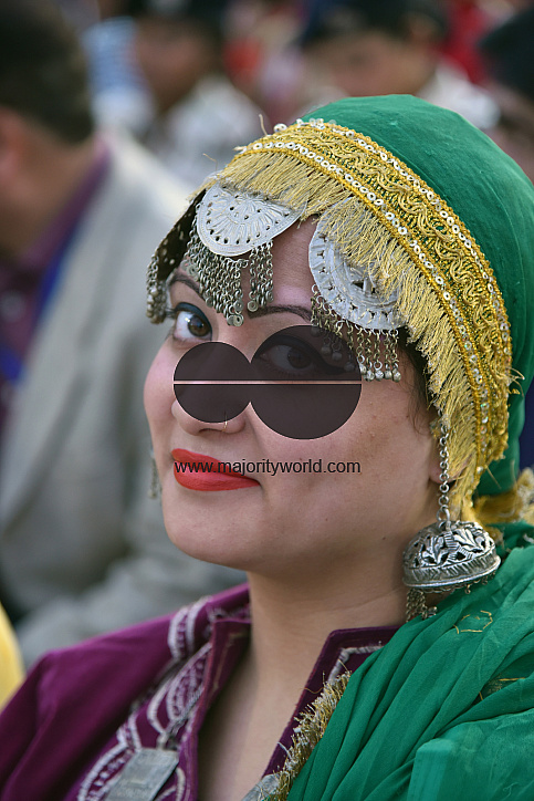 • Image Description: Portrait of a tribal woman. Tribal participants with their traditional dresses during the all India tribal festival organized by the Ministry of Tribal Affairs. India.