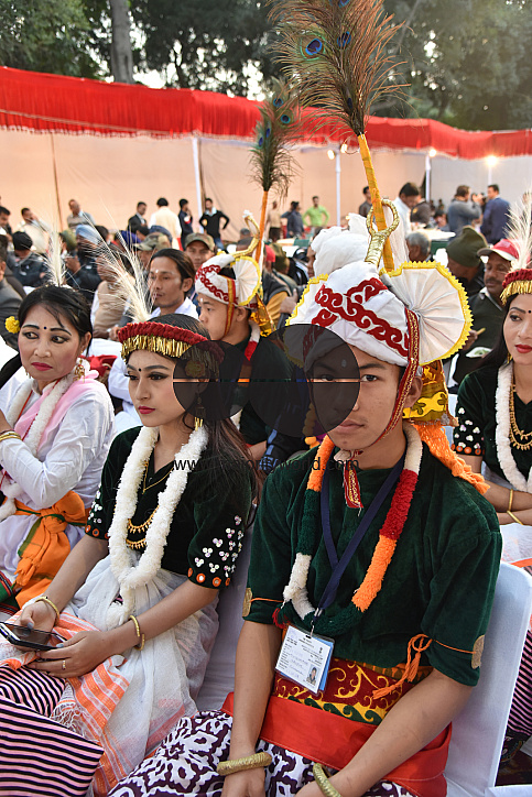 • Image Description: Tribal participants with their traditional dresses during the all India tribal festival organized by the Ministry of Tribal Affairs. India.