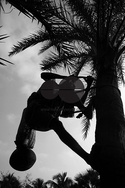 A tree climber, known locally as a gachee, collects juice from a date palm tree. Gachees collect juice by pealing the skin of the top of the tree and tying an earthen pot below. Jessore, Bangladesh. December 17, 2008.