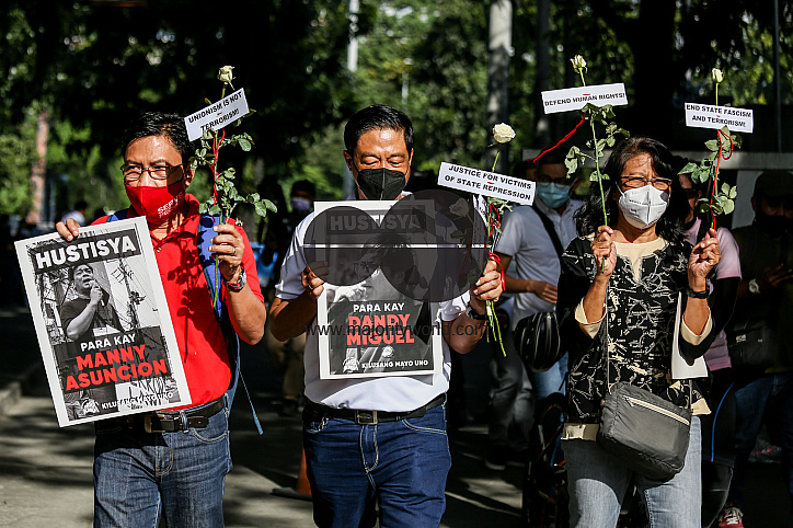 • Description: Human rights activists carry signs and offer flowers to remember fallen heroes in commemoration of the 73rd International Human Rights Day in Quezon City, Metro Manila. The monument honors the martyrs and heroes who struggled against the 21-year dictatorship of former President Ferdinand Marcos. Philippines.
