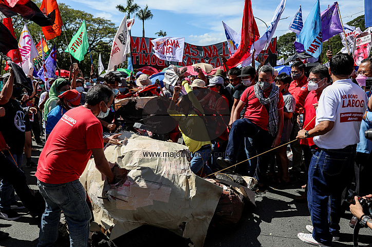 • Image Description: Protesters destroy an effigy of Philippine President Rodrigo Duterte during a protest to mark the 73rd International Human Rights Day at the University of the Philippines in Quezon City, Metro Manila. Thousands of activists from various groups rallied aga