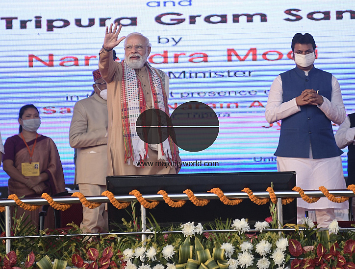 • Image Description: Prime Minister Narendra Modi waves and speaks to supporters during the inauguration of a new Integrated Terminal Building at the Maharaja Bir Bikram (MBB) airport in Agartala. Tripura, India.