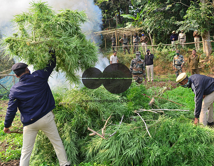 Police and TSR (Tripura State Rifles) personnel are destroying illegally planted marijuana plants on the outskirts of Agartala. Tripura, India.