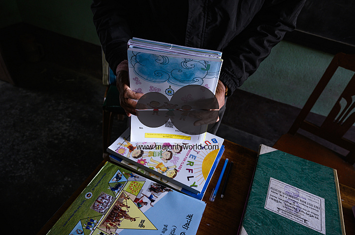 Students are being admitted to a rural primary school and new school books are distributed freely to the students which are provided by the government. Nabin Nagar, India.