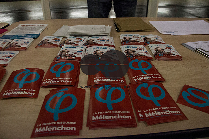 Movement campaign accessories France Insoumise. The goodies of the campaign JLM 2017 of Jean-Luc Mélenchon, candidate in the presidential election. France.