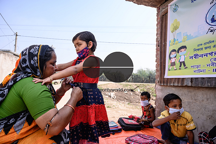 An India-Bangladesh border side primary school's class is conducted on an empty road next to the fence at Nabin Nagar, West Bengal. The state government of West Bengal launched âParay Shikshalayaâ, a community-based schooling program targeting primary students who have dropped out of the formal education system in the past two years due to the closure of schools because of Covid-19. India.