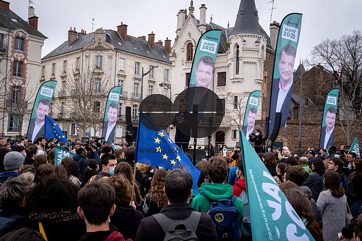 Yannick Jadot, Member of the European Parliament and candidate for the presidential election of the Europe Ecologie Les Verts (EELV) party, in Rennes to hold a meeting on the Place Hoche. Rennes, Brittany. France.