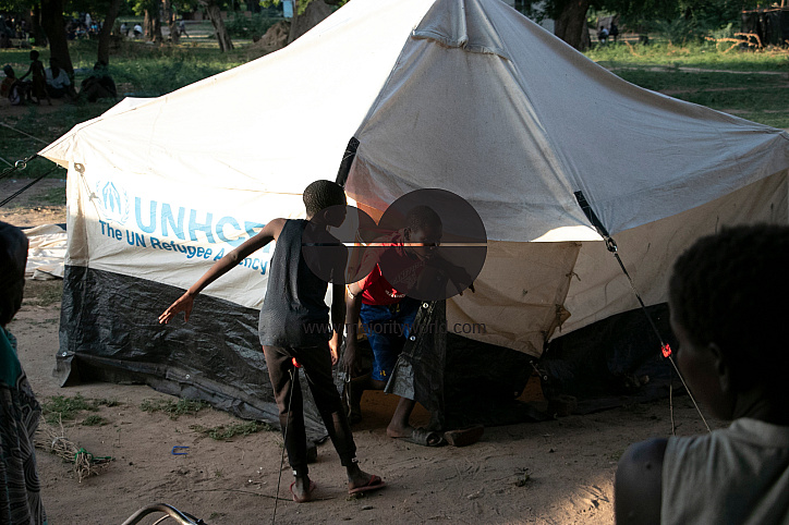 Children are seen outside a tent at Bangula Camp in Nsanje district where thousands of internally displaced people are being housed. Malawi was hit by tropical cyclone ana which caused floods and destroyed houses. Malawi.