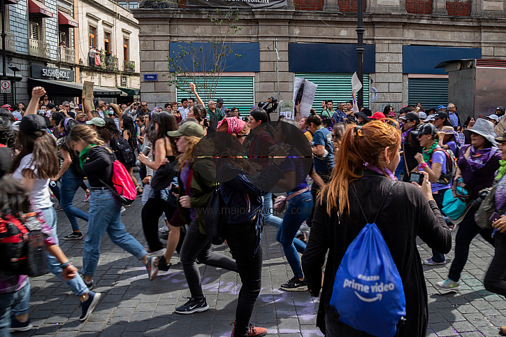 A group of women during a Feminist March with over 80,000 participants in Mexico city. In Mexico at least 10 women are killed everyday and there is a big gender inequality. At this march women mainly were dressed with purple, green and black. Purple symbo
