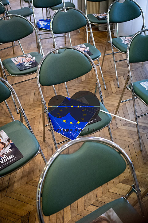 As part of Emmanuel Macron's campaign for the presidential election, a support meeting in Saint-Malo with the Minister of Foreign Affairs Jean-Yves Le Drian and the European Deputy Marie-Pierre Vedrenne. The main points discussed were the invasion of Ukraine by Russia and the European Union. Saint-Malo, Brittany. France.