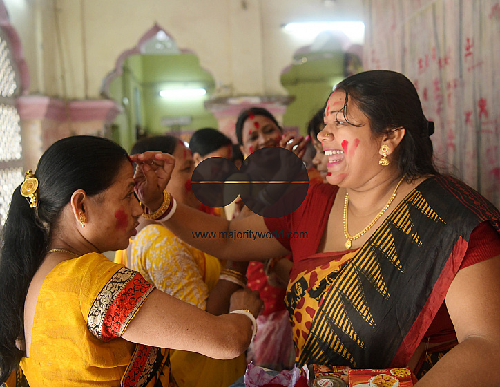 • Image Description: Female devotees share Sindur, red holy powder with each other at the Lakshmi narayan temple for the good of the family on the occasion of Pohela Boishakh, the Bengali new year in Agartala. Tripura, India.