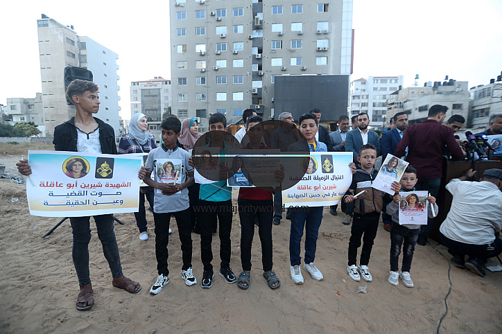 • Description: Gaza City, Palestine. 11th May 2022. Members and families of the Palestinian Journalists Syndicate take part in a protest in Gaza City to denounce the killing of Al Jazeera reporter Shireen Abu Akleh. Abu Akleh, 51, a prominent figure in the Arabic news service of Al-Jazeera channel was shot dead earlier today during a confrontation between Israeli soldiers and Palestinians in the West Bank City of Jenin.