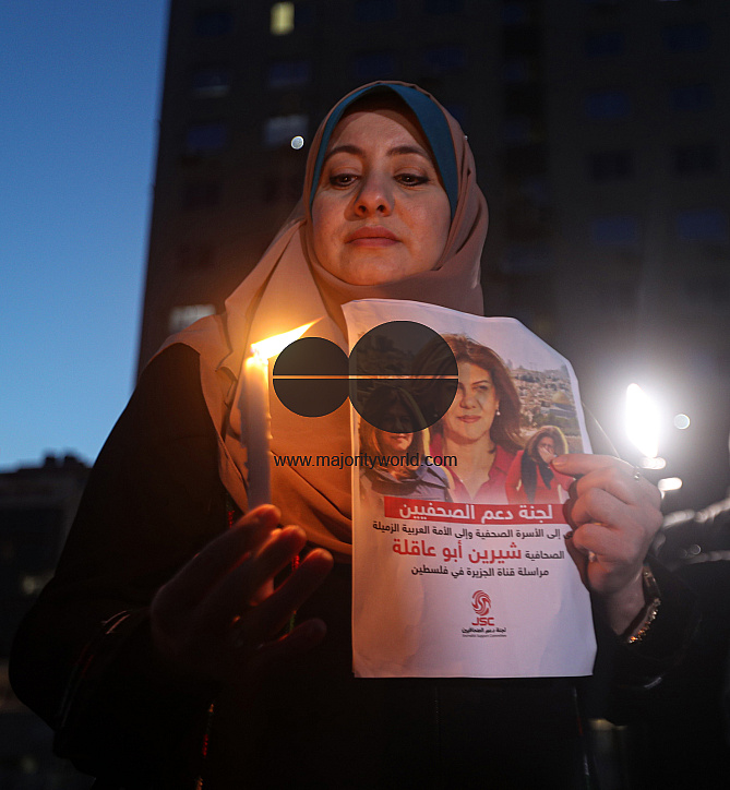 Gaza City, Palestine. 11th May 2022. Members and families of the Palestinian Journalists Syndicate take part in a protest in Gaza City to denounce the killing of Al Jazeera reporter Shireen Abu Akleh. Abu Akleh, 51, a prominent figure in the Arabic news s