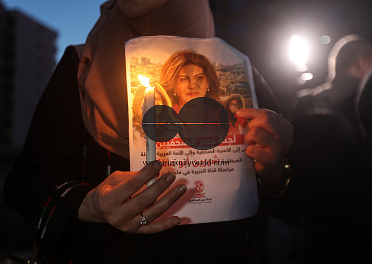 • Description: Gaza City, Palestine. 11th May 2022. Members and families of the Palestinian Journalists Syndicate take part in a protest in Gaza City to denounce the killing of Al Jazeera reporter Shireen Abu Akleh. Abu Akleh, 51, a prominent figure in the Arabic news service of Al-Jazeera channel was shot dead earlier today during a confrontation between Israeli soldiers and Palestinians in the West Bank City of Jenin.
