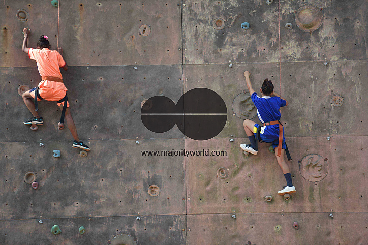 • Description: Young people climbing an artificial wall during the "State Level Sport Climbing Coaching Camp" at the Sport Climbing Centre, Dasaratha Dev State sports Complex, at Agartala. Tripura, India.