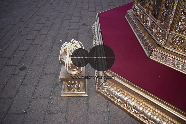 Flower arrangements at a pirith mandapa been constructed for pirith ceremony for vesak at the protest site. The protest continues amidst curfew and emergency law with the security forces allowed to shoot in case of violence. People gathered in large numbers on Vesak poya day at Galle face where the main protest has being held named Gota Go Gama for over a month. Colombo, Sri Lanka.