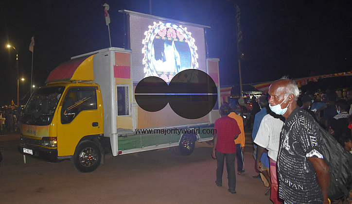 Movie screen at the protest site. The protest continues amidst curfew and emergency law with the security forces allowed to shoot in case of violence. People gathered in large numbers on Vesak poya day at Galle face where the main protest has being held named Gota Go Gama for over a month. Colombo, Sri Lanka.