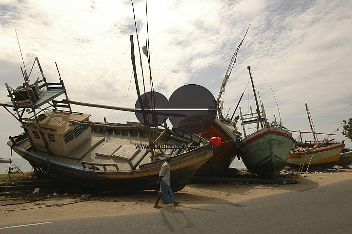 Tsunami was so severe in this area that it throw most anchored fishing boat on the port meters away from the sea on the main road and into the residential areas, causing enormous damage, destruction and havoc. Galle city. Southern Sri Lanka.
