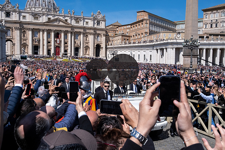 Holy ground. Large crowds at the Easter Sunday mass and Benediction at St Peter's Square in the presence of Pope Francis. State of Vatican City.