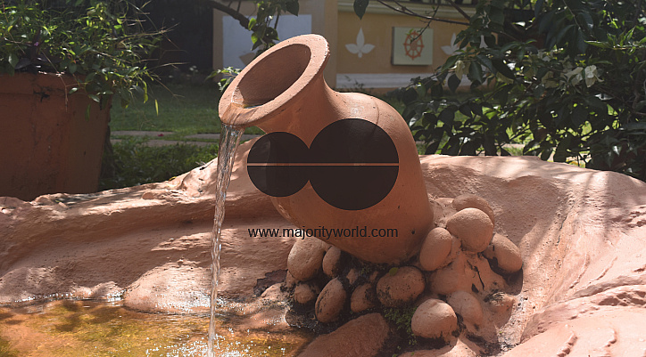 A landscaped garden with herbal trees, flowers, fruit trees, ponds, fountains, Buddhist statues, garden benches and many more for a relaxing time at an Ayurveda spa. Colombo. Sri Lanka.