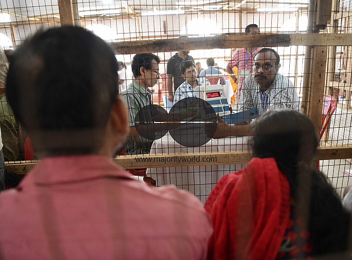 Election staff members with an electronic voting machine (EVM) during the counting of votes of the Tripura Assembly By-Election, at a counting centre in Agartala. Tripura, India.