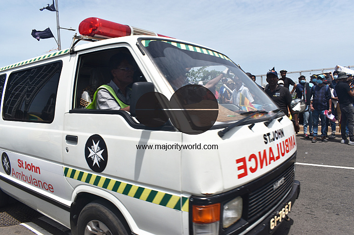 Colombo, Sri Lanka. 7th July 2022. Ambulence rushing of with injured person. Thousands of protesters stormed the Sri Lankan president's official residence, president's secretariat, prime minister's official residence and set fire to the prime minister's private residence as anger intensified over the country's worst economic crisis in seven decades. People from all over the country gathered at the Galle Face green in protest which went on into the night.