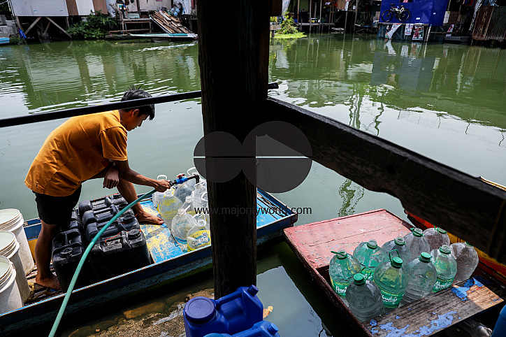 A man collects water using plastic containers at a small dock inside the Artex Compound in Malabon, Metro Manila. The village has been flooded by stagnant waters for several years. The inhabitants, who are mostly poor, have to use boats for their daily mo