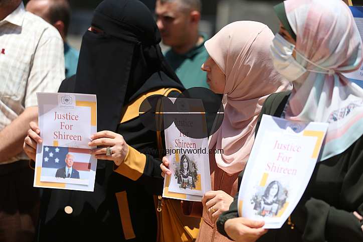 • Description: Gaza City, Palestine. 13th July 2022. Palestinian Journalists hold posters with words reading "Justice for Shireen" during a protest in Gaza. Palestinian Journalists organised a protest demanding justice or the Palestinian journalist Shireen Abu Akleh who was killed in Jenin City last month. They are demonstrating ahead of American president Joe Biden's visit to Israel and the Palestinian territories today.
