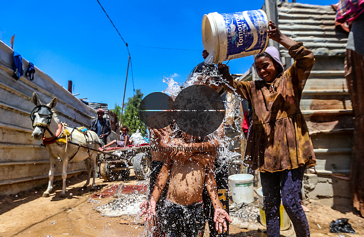 • Description: Gaza City, Palestine. 14th July 2022. A Palestinian mother showering her children in a plastic tub at a poor area north of Gaza City. Most services including clean water supply and sanitation are not available in the area. Therefore families use all kinds of tubs, pots and containers to transport water to their houses.