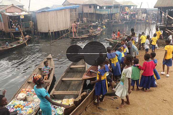 School kids from Whanyinna school Makoko, buy food items during a break at the Makoko fishing community on the Lagos lagoon. Makoko is a slum community located in Lagos. Established in the 18th century primarily as a fishing village, much of Makoko is mad