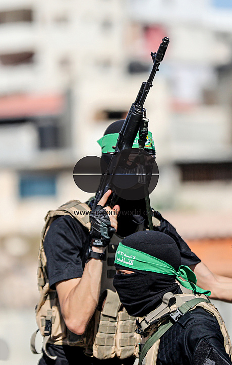 Gunmen from the Izz al-Din al-Qassam Brigades, the military wing of Hamas, during an anti-Israel military march in Gaza City, Gaza Strip. Palestine.