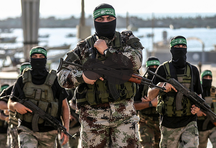 Gunmen from the Izz al-Din al-Qassam Brigades, the military wing of Hamas, during an anti-Israel military march in Gaza City, Gaza Strip. Palestine.