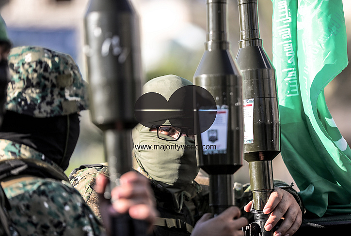 Gunmen from the Izz al-Din al-Qassam Brigades, the military wing of Hamas, during an anti-Israel military march in Gaza City, Gaza Strip. Palestine.