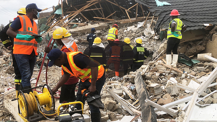 Abuja, Nigeria. 29th August 2022. Rescue workers at the scene of a collapsed building in Kubwa, a suburb of Abuja, Nigeriaâs capital city. Two persons were confirmed dead after a three-storey building under reconstruction collapsed.