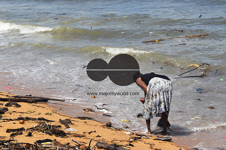People collecting Wood and plastic wastage which has washed ashore due to rough seas in the Indian ocean in the outskirts of Colombo. They use the wood as firewood for cooking and sell the plastic for recycling purposes. Sri Lanka.