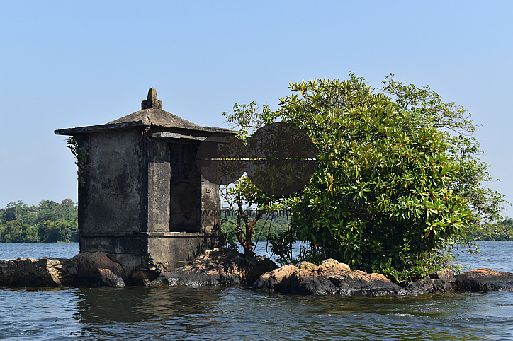 • Description: The smallest islet in Madu Ganga Lake is called “Satha Paha Doowa”. “Paha” translates to “five”, whereas “Satha” means “cent”. According to local tradition, the islet had once been purchased for five cents. But others say, it got its name due to the shape or small size which resembles just a small coin. Nontheless Fice-Cent-Island is big enough to carry a temple. The shrine is dedicated to Kataragama, a deity revered by Sinhalese Buddhists and Tamil Hindus and Weddah animists alike. In a way, it’s a Devale, a Buddhist shrine for a Hindu deity. Sri Lanka.