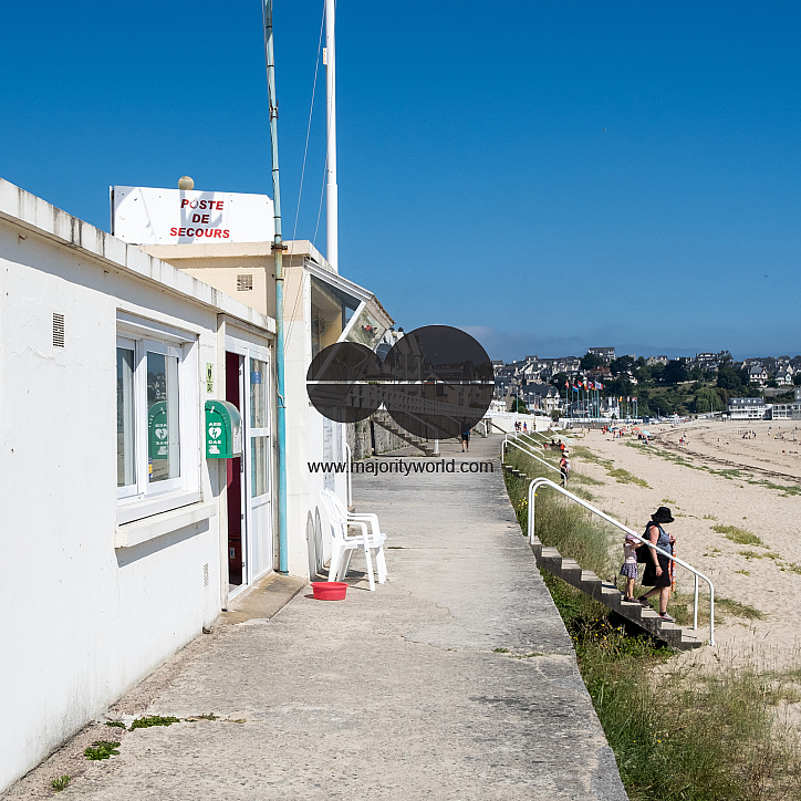 First aid station on the beach of Saint Cast Le Guildo, a commune in the Côtes-d'Armor department of Brittany in northwestern France.