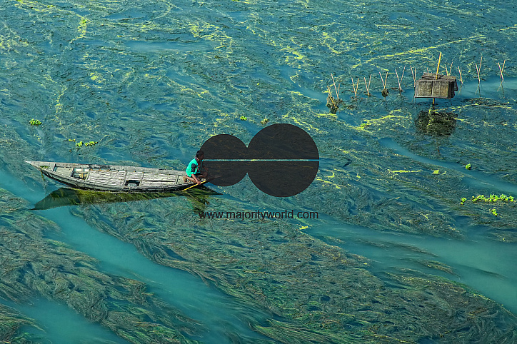 Fishermen floating on top of algae trying to catch fish in the green waters of a river. The Sirajganj spot in Bangladesh is a popular place for locals to swim and bathe even in the cold water. Algae makes the water cloudy and climate change causes the riv