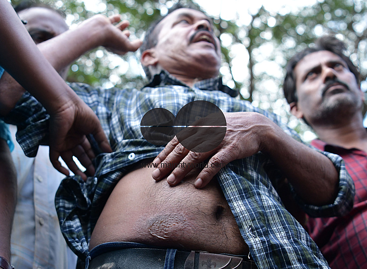 A teacher who was terminated from work is showing his wound, after been hit by a tear gas shell after a scuffle with police at a protest site, in Agartala. Tripura, India.