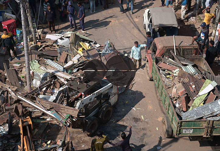 • Image Description: AMC (Agartala Municipal Corporation) workers destroying illegal liquor shops along with police personnel at the Battala market area at Agartala. Tripura, India.