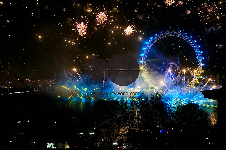 New Year celebrations at Whitehall Court rooftop light up the London skyline, reflecting the London Eye and the Thames skyline with fireworks. London, United Kingdom.