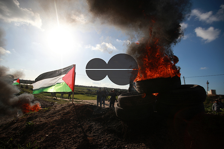 Gaza City. Palestine. February 22nd, 2023. A demonstrator holds the Palestinian flag in front of burning tires during a demonstration along the border between the Gaza Strip and Israel, in solidarity with Nablus city against the Israeli military operations that killed at least ten Palestinians.