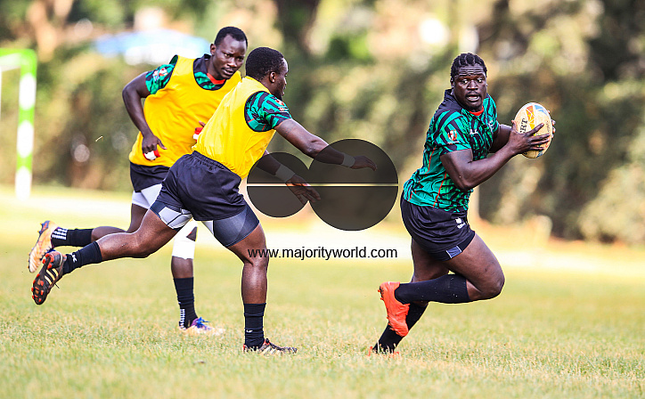 Kenya's Shujaa forward Alvin Otieno (right) charges past teammates during a training session for the HSBC World sevens Rugby series at Ruaraka, KCB Sports Club. Nairobi. Kenya.