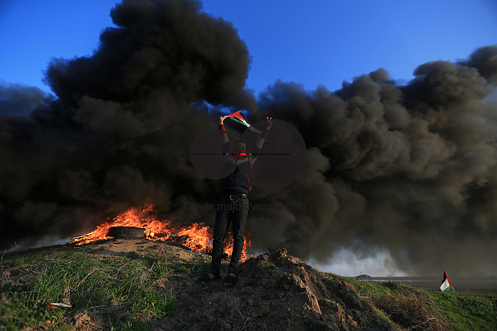 • Description: Demonstrators hold the Palestinian flag in front of burning tires during a demonstration along the border between the Gaza Strip and Israel, in solidarity with the Jenin camp against the Israeli military operations that killed at least nine Palestinians. Palestinian Territories, Gaza City.