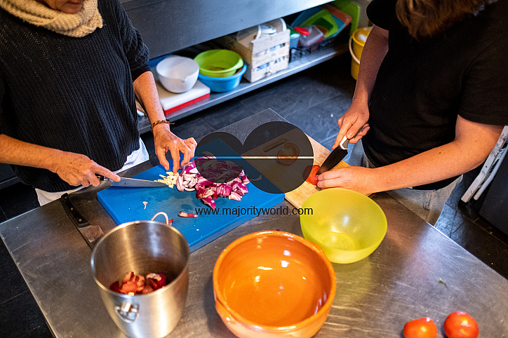 Families cooking at eating healthy, herbal and nutritious food at the eco-village of Loural in the mountains of central Portugal. Here, the Klein family and their partners have been working on an ambitious project to rehabilitate a small village that has been abandoned since the year 2000 into an eco-location. On 30 hectares, the aim is to improve the ecosystem by practicing organic agriculture, reforestation and the production of green energy. The small stone village is moving towards food and energy autonomy and its vegetation is gradually coming back to life. The place is starting to provide integrative health training and artistic activities, its final vocation. Loural, Coimbra region, Portugal.
